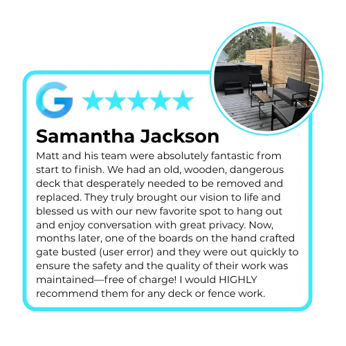 You get peace of mind from deck builders who answer their phone, show up when promised, and finish what they start. Your family gets the beautiful outdoor space you've been dreaming of without the typical deck builder drama that ruins home improvement projects.